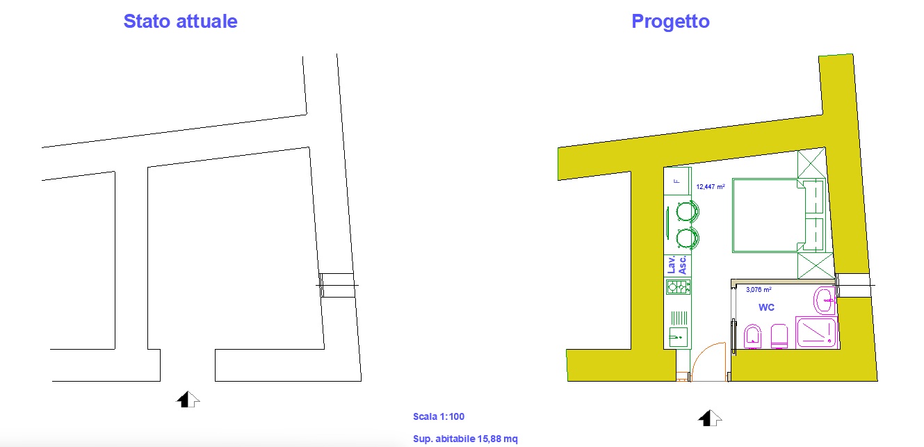 Prescindendo ulteriori approfondimenti sull'alloggio improprio, soprattutto su quanto previsto dalla normativa nazionale con D.M. 5 luglio 1975, il Regolamento Regionale Campania del 28 ottobre 2019, ed il Regolamento Edilizio del Comune di Napoli, quasi sempre in contrasto, illustreremo la progettazione seguente di un vano situato al piano terra a Porta San Gennaro in Napoli, che non ha mai mutato la destinazione d'uso A/5 e che resta un gioiello pur non avendo l'accesso interno dal palazzo.